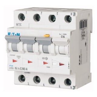 Eaton Industries MRB 6 aardlekautomaat 3, uitschakelkarakteristiek C, nom. (meet)spanning 400V, nom. (meet-)stroom 16A, nom. foutstroom 0.03A, type lekstroom A, energiebegrenzingsklasse 3, nom. afschakelvermogen EN 60898 6kA, frequentie 50Hz, meeschakelende nul, overspanningscategorie 3,