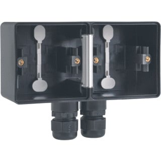 Spuitwaterdichte dubbele horizontale opbouwdoos met tweevoudige M20-ingang met wartels voor het inbouwen van twee functies, black. De bevestigingspunten van deze dubbele horizontale doos bevinden zich op de verticale as 50 mm uit elkaar geplaatst en op de horizontale as 71 mm uit elkaar geplaatst. Deze maataanduiding bevindt zich onuitwisbaar op de bodem van elke doos. De ovale schroefopeningen laten toe een onnauwkeurige boring op te vangen. Een afdichting waarborgt, door een persborging, de beschermingsgraad en de dubbele isolatie. De doos beschikt over twee overhoeks uitbreekbare condensatieopeningen. De opbouwdoos is vervaardigd uit slagvast, stofwerend, halogeenvrij en zelfdovend polypropyleen (UL94-V2/1,6 mm).
