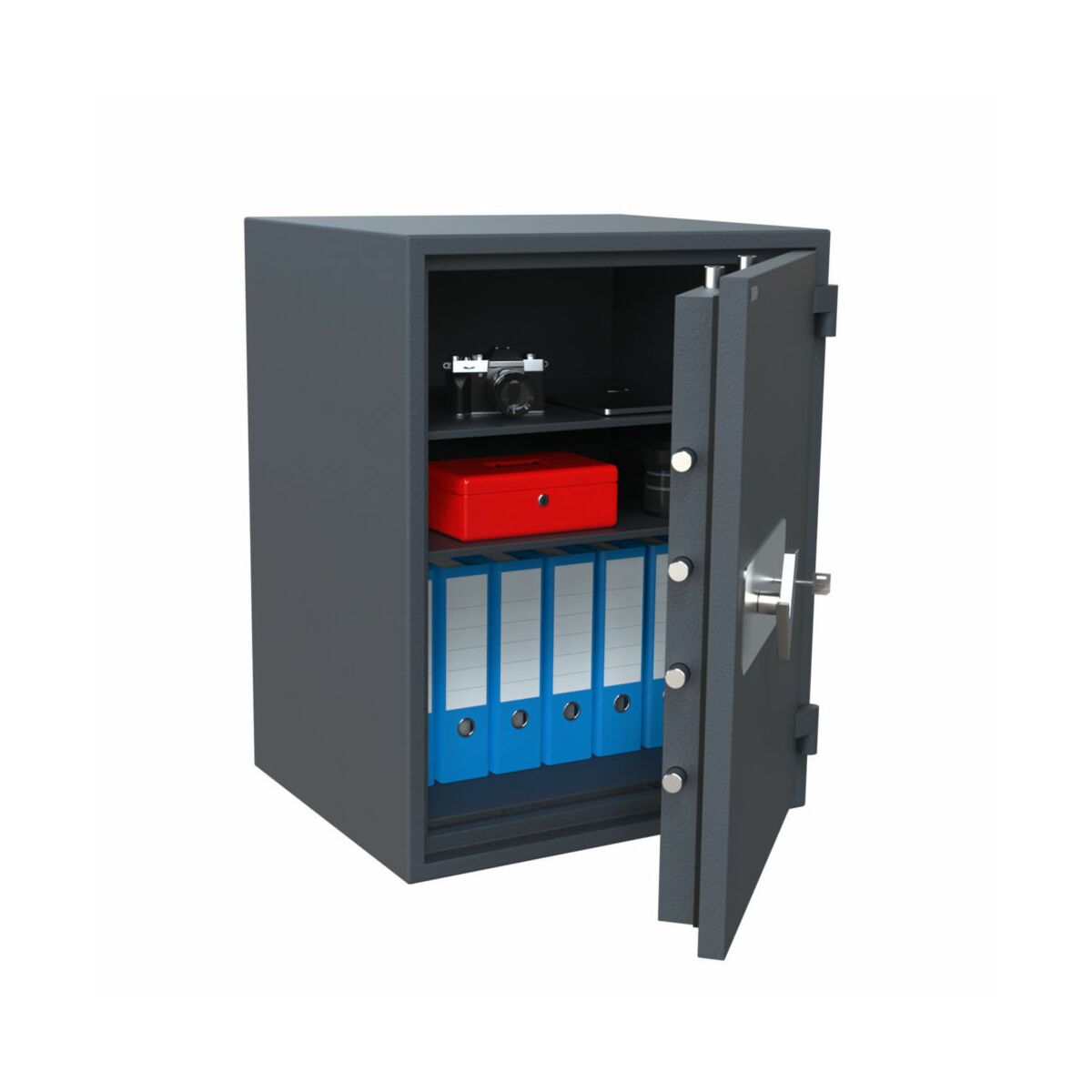 Bovendien biedt de kluis ECB-S gecertificeerde brandwerendheid volgens EN 15659 LFS30P, wat inhoudt dat documenten tot 30 minuten beschermd blijven tegen brand. Dit biedt een belangrijke bescherming voor waardevolle papieren, zoals eigendomspapieren, contracten of andere belangrijke documenten die niet verloren mogen gaan bij brand.